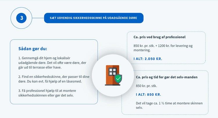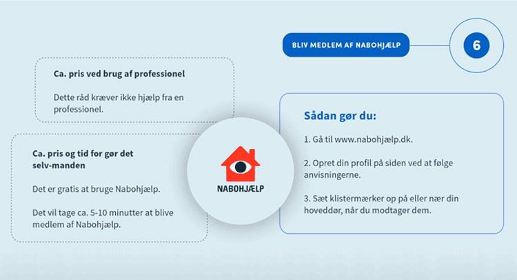 Nedenstående infografik vejleder dig i, hvordan du udfører hvert råd, og den fortæller dig, hvad det vil koste – både hvis du får professionel hjælp eller gør det selv.